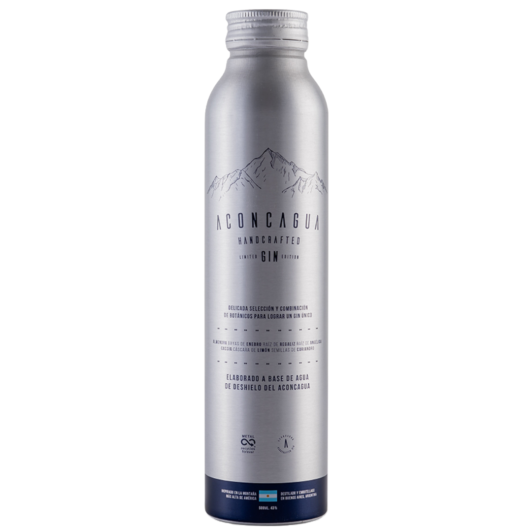 Gin Aconcagua. Botella de aluminio. Un Gin hecho a mano en Buenos Aires, Argentina. Nuestra esencia es extraída a partir de 7 botánicos: Bayas de Enebro, Semillas de Coriandro, Raíz de Angelica, Raíz de Regaliz, Almendra, Cassia, Cáscara de Limón. Gracias a un meticuloso proceso de maceración y destilación en alambique de cobre obtenemos nuestro Gin Aconcagua.